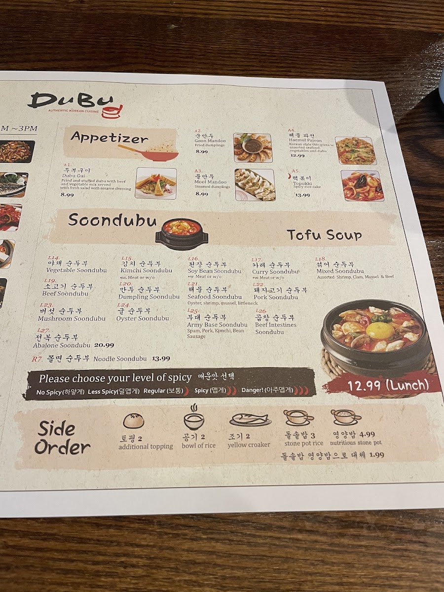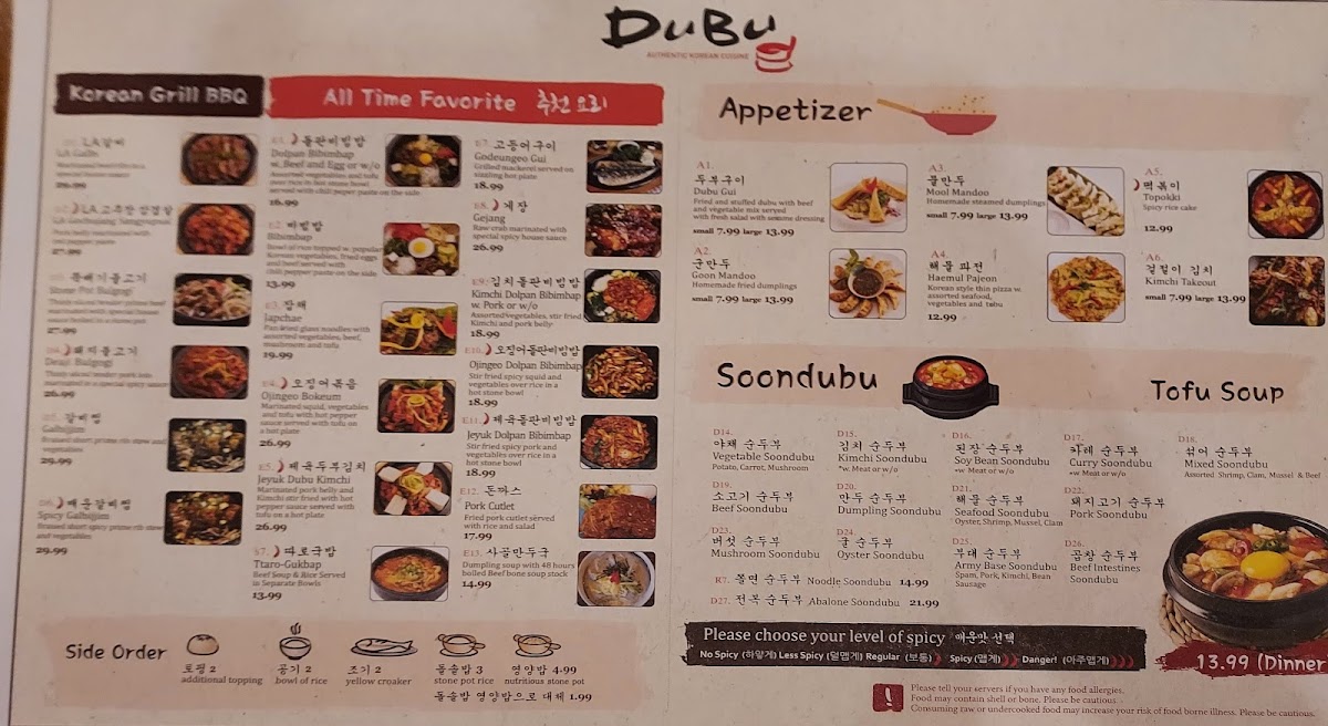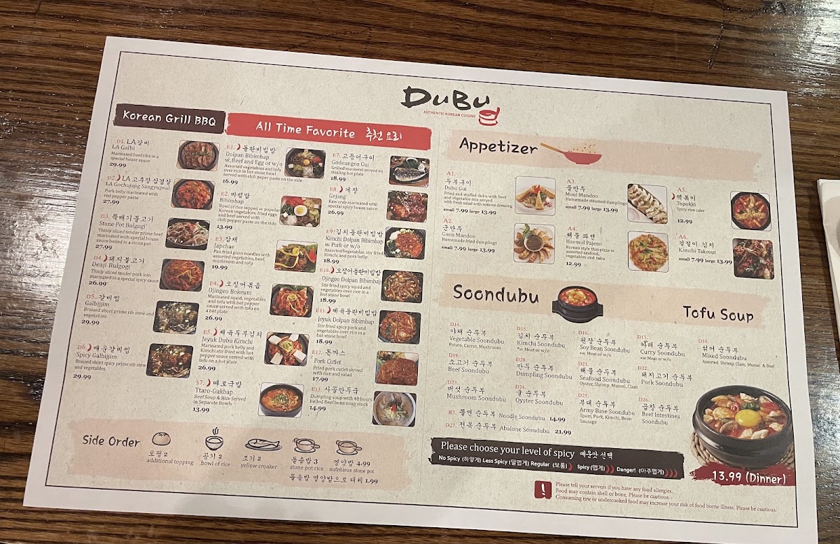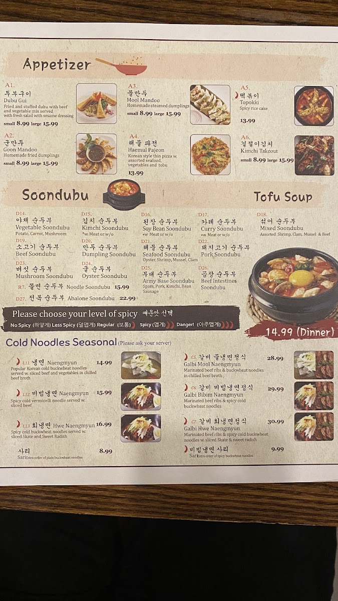 - Soups: The Seafood SoonDubu and Pork SoonDubu are both rich in flavors at just $17.99 each, offering a comforting experience.